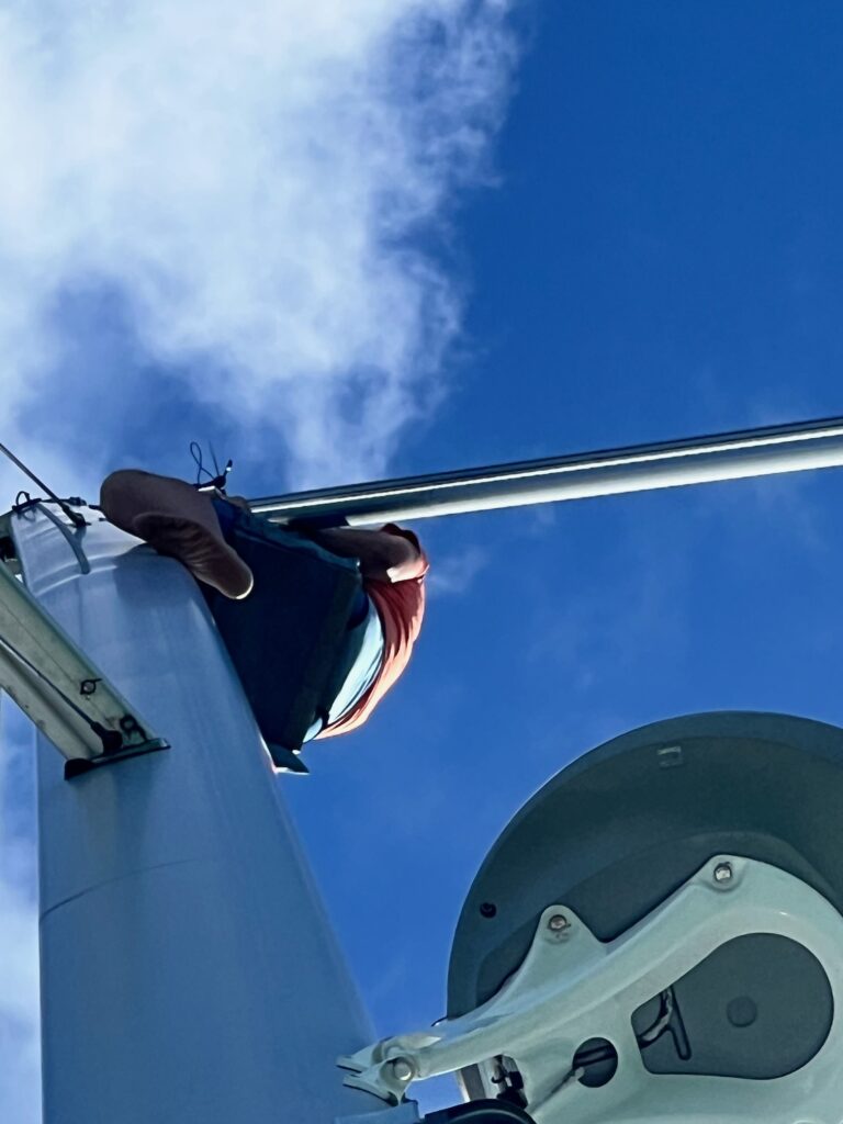 “The lazy jacks on the starboard side have failed,” said Jeff in his usual calm voice. “The lines were dragging in the water, so I tied up the ends to the boom.”