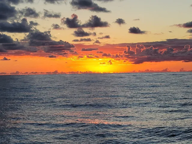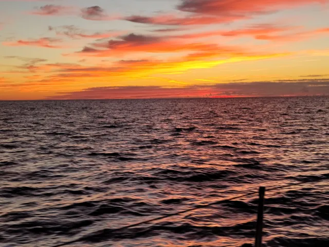 It is easy to know when you are in the gulfstream. The temperature goes up 10 degrees and off come the winter clothes. Shorts and T-shirts become the usual attire on deck. The wind is warm, and in this case the seas were gentle. There was a combination on sailing, motor sailing and when the wind shifted to the stern, we took the sails down and motored. The gentle waves and calmness were what every sailor hopes for in a crossing. In short it was paradise. In the evenings we would experience epic sunsets, and in the mornings glorious sunrises to begin yet another beautiful day. The days melted into each other.
